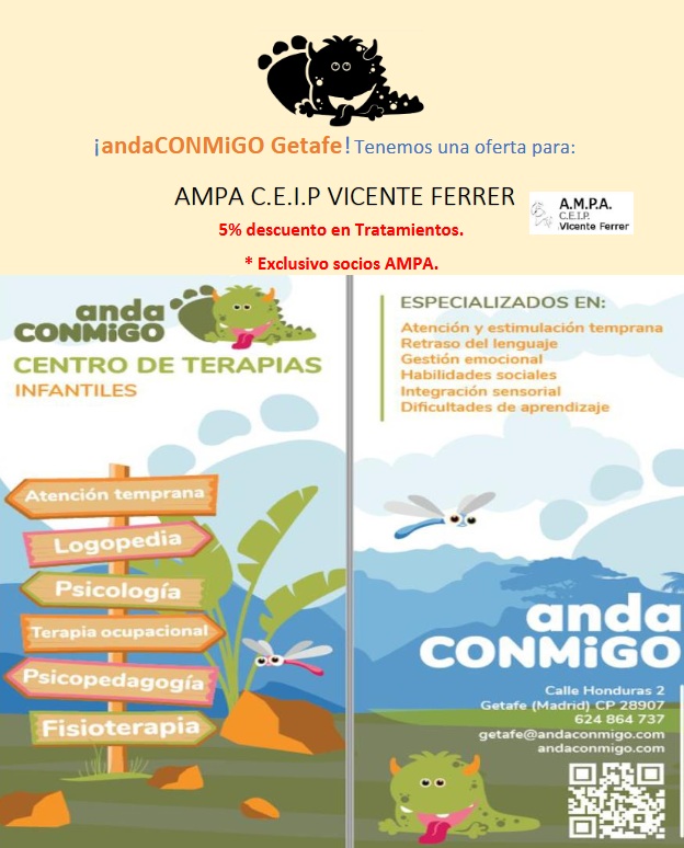 Ofrecen un 5% de descuento en todos sus tratamientos para los socios del AMPA. AndaCONMIGO es un centro especializado en terapias para el desarrollo infantil, proporcionando servicios como fisioterapia, logopedia y psicología, entre otros.