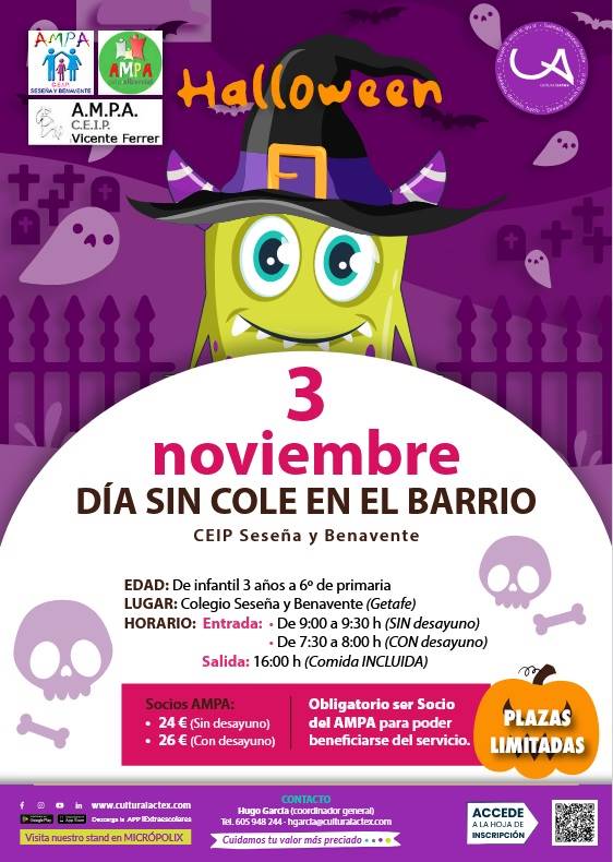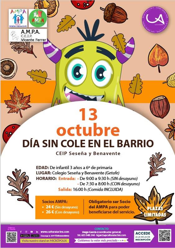 Días sin Cole 13 de octubre y 3 de noviembre Públicado en 30/09/202530/09/2025 por Ampa Vicente Ferrer Desde el CEIP Seseña y Benavente nos ofrecen la oportunidad de conciliar los días 13 de octubre y 3 de noviembre en su colegio. Para inscribiros debéis seguir el siguiente enlace Inscripción